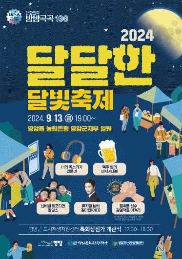 이번 달빛축제는 더욱 색다른 프로그램으로 돌아왔다. 축제는 영암읍 풍물패의 흥겨운 식전공연으로 시작된다. 이어지는 프로그램으로 밴드 야다 출신의 뮤지컬배우 김다현이 펼치는 팝페라 공연은 축제의 서막을 연다. 다음으로 가족오락관 '고요 속의 외침'을 모티브로 한 '너의 목소리가 안들려' 프로그램은 주민과 방문객들이 함께 즐길 수 있는 재미있는 게임이다. 여기에 더해, 맥주 빨리 마시기 대회도 열려 참가자들의 뜨거운 경쟁을 예상케 한다. 또한 '김영덕을 이겨라' 팔씨름 체험은 팔씨름 프로선수와의 대결을 통해 참가자들에게 짜릿한 도전의 기회를 제공한다. 특히 참여 프로그램 참가자들에게 소정의 영암사랑상품권을 증정하여 축제의 열기를 올리고 지역 상권 활성화에 이바지할 예정이다. 마지막 하이라이트 세계 코미디 대회 1위로 전 세계인의 마음을 사로잡은 유쾌한 코미디 그룹 옹알스의 공연이 준비되어 있어 관객들에게 큰 웃음을 선사할 예정이다.
