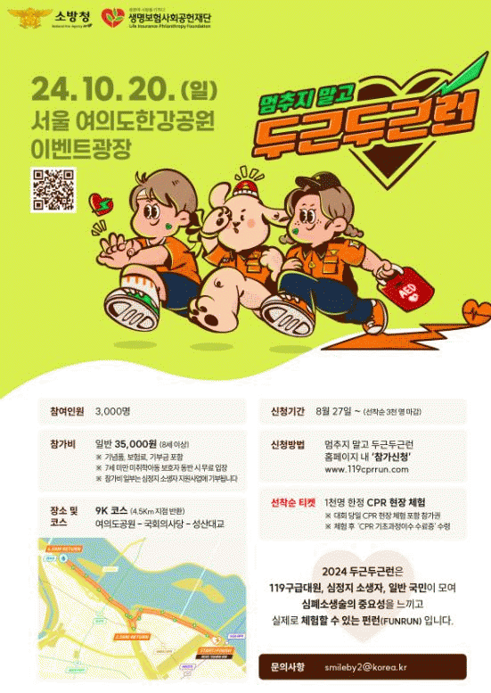오는 10월 20일 일요일 오전 8시, 서울 여의도 한강공원 이벤트 광장에서 개최될 예정으로 참여를 원하는 누구나 ‘두근두근런 홈페이지’를 통해 참여 신청하고 마라톤과 함께 심폐소생술 교육을 즐기며 배울 수 있다.