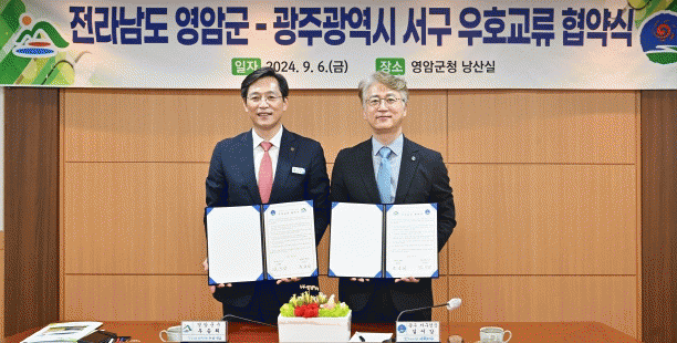 김이강 서구청장은 “7년 연속 혁신평가 우수기관 선정을 이끌어 낸 서구와 혁신으로 도약하는 영암은 주민이 만족하고 일상에서 체감할 수 있는 혁신정책을 실현하기 위해 끊임없이 적극행정을 실천하는 공통분모를 가지고 있다”며 “이번 협약이 양 도시가 서로의 장점을 배우고 자원을 공유하며 구정구호처럼 함께 우뚝 서고 더 크게 상생 발전하는 계기가 되길 바란다”고 말했다.