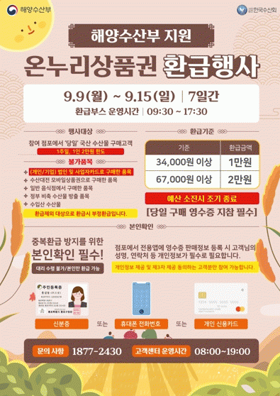 ‘온누리상품권 환급행사’ 기간에 국내산 수산물을 구입하면 당일 구매금액의 30%를 온누리상품권으로 환급(1인 최대 2만원)해준다.