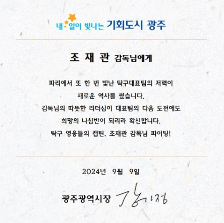 강기정 시장은 이날 광주시 소속 선수단에 축하 메시지를 보내 “파리에서 보여준 혼신의 노력이 새로운 희망의 사다리를 놓았다”며 “우리의 가슴을 뛰게 한 열여섯 영웅들의 파리이야기를 잊지 않고 기억하겠다”고 응원했다.