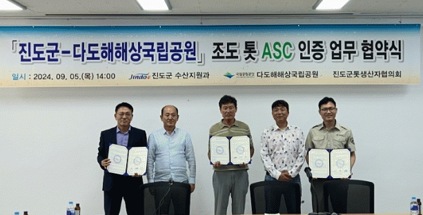 이번에 체결한 협약은 전복양식장 국제인증(ASC)에 이어 진도군의 대표 해조류인 톳 양식장까지 국제인증(ASC-MSC)을 확대 추진하고자 협약을 체결했으며, 지속 가능한 친환경 양식환경 조성과 2025년에 해조류 양식장에 대한 국제인증을 목표로 어민 교육과 양식장 환경개선 등을 통해 해양생태계 보전 사업을 계속 추진할 예정이다.