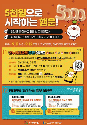▲소상공인시장진흥공단 북부센터 ▲전남대 후문 골목형상점가 ▲전남대 총학생회와 협력해 추진되는 이번 행사는 온누리상품권(카드형) 5천 원 이상 구매자에게 5천 원을 추가 충전해주는 ‘구매 보상 이벤트’와 ‘홍보 부스’ 등이 운영될 예정이다.