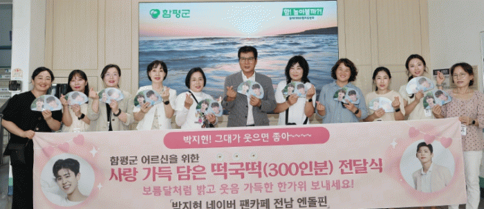 이상익 함평군수는 “엔돌핀 전남지역 팬클럽의 후원으로 함평군 어르신들이 넉넉하고 풍성한 추석 명절을 보낼 수 있게 됐다”며 “박지현 가수의 선한 영향력이 널리 퍼져나가 훈훈한 인정이 넘치는 지역 공동체가 되기를 소망한다”고 감사의 뜻을 전했다.