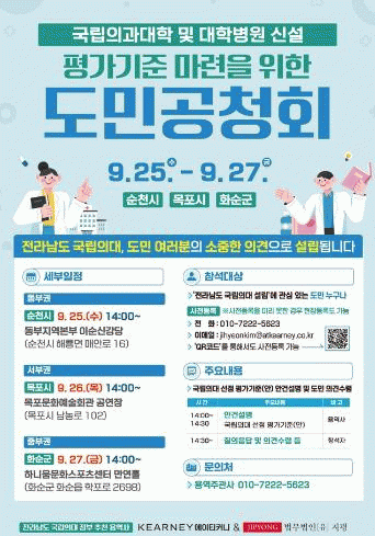 먼저, 순천시에서 열릴 동부권 공청회는 오는 25일 전라남도 동부지역본부 이순신강당에서 개최되고, 서부권인 목포시에서는 다음날인 26일 목포문화예술회관 공연장(갓바위)에서 열린다.