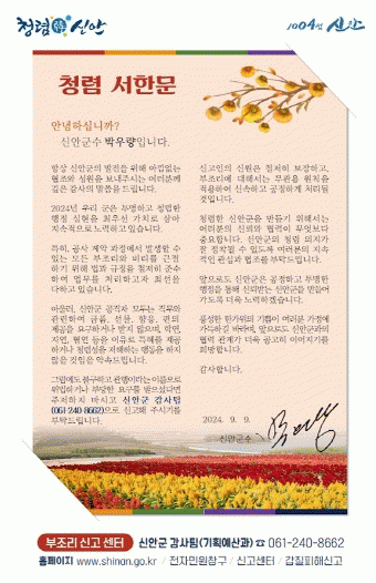 아울러, 신안군은 소속 공직자에게도 청렴서한문을 보내 신뢰의 밑바탕이 되는 청렴과 공정에 대해 강조하며 관행적 선물이 금품과 향응의 다른 이름이 될 수 있음을 일깨워 청렴한 명절 분위기를 조성했다.