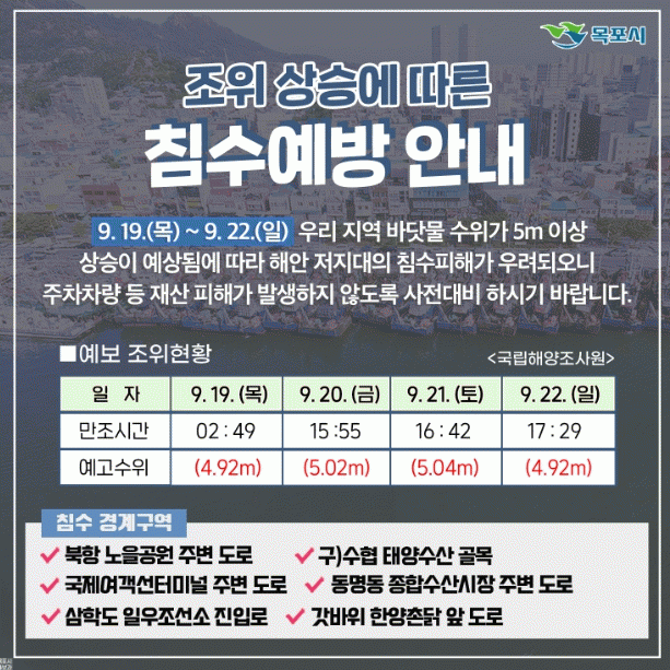 한편, 목포시는 바닷물 수위가 조석표상 조고 4.90m이상일 경우 해수 위험일로 지정해 시민들의 재산피해가 발생하지 않도록 침수피해 예방에 적극 대처하고 있다.