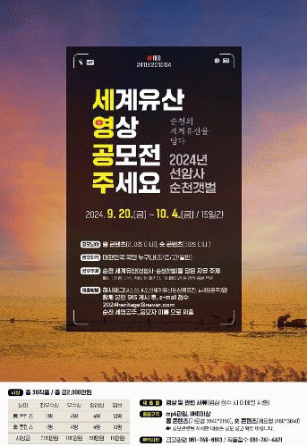 ‘순천 세계유산 영상 공모전’은 순천의 세계유산인 선암사 및 순천 갯벌과 관련된 자유 주제의 영상을 200초 이내 롱 콘텐츠와 60초 이내 숏 콘텐츠 두 가지 분야로 공모한다.
