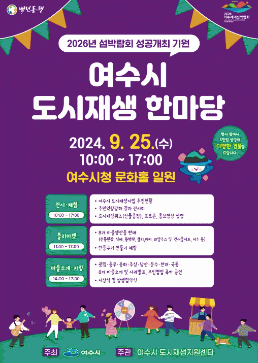 부대행사로는 룰렛 게임, 도시재생 퀴즈 등을 운영하며, 참여자에게는 소정의 상품과 2026여수세계섬박람회 성공개최 홍보 기념품을 증정할 계획이다.