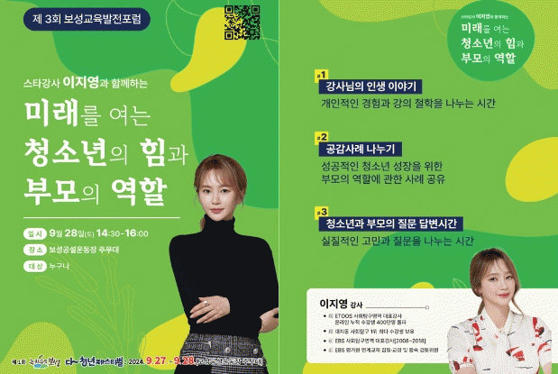 이날 이지영 강사는 청소년 교육과 부모의 역할에 대한 깊이 있는 통찰을 바탕으로, 청소년들이 미래를 준비하는 데 필요한 역량과 부모의 지원 방법에 대해 강연할 예정이다.