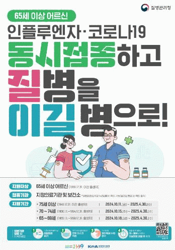 어르신은 ▲75세 이상 10월 11일부터 시작하며, ▲70세부터 74세 10월 15일부터 ▲65세부터 69세는 10월 18일부터 2025년 4월 30일까지 무료 접종을 실시한다.