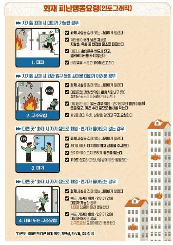 아파트는 화재 발생 시 건물 전체로 연기가 확산하기 때문에 연기(유독가스)를 피할 수 있도록 피난 시 행동요령을 숙지하는 것이 중요하다.