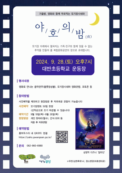 야호센터는 28일 저녁 7시부터 대반초등학교 운동장에서 ‘제1회 야호의 밤(夜) -모기장 시네마’를 개최한다고 밝혔다.