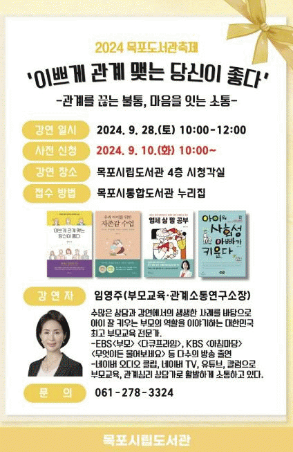 도서관 관계자는 “이번 강연과 2024 목포도서관축제에 많은 관심 가져주시기를 바라며, 앞으로도 시민들을 위한 다양한 주제의 강연을 추진하겠다”고 말했다.