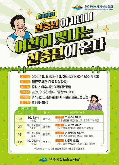 참여 희망자는 오는 23일부터 여수시립도서관 누리집을 통해 신청하면 되며 강의별로 20명씩 선착순 마감된다.