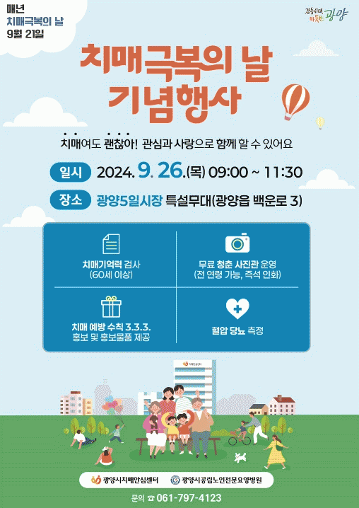 서영옥 건강증진과장은 “이번 행사는 시민들이 치매를 예방하고 건강한 노후를 준비할 수 있는 소중한 기회”라며 “많은 시민이 참여해 치매에 대한 관심도를 높이고 서로의 건강과 행복을 함께 나누는 시간이 되기를 기대한다”라고 말했다.