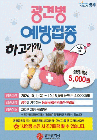 광주시는 해마다 봄과 가을 두 차례 광견병 예방접종 사업을 실시하고 있으며, 하반기에는 백신 4000두 분량을 지정 동물병원 80여 곳에 지원했다.