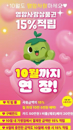9월과 마찬가지로 이번 이벤트의 구매한도는 1인 월 70만원(카드 50, 모바일 20)이고, 10월 내에 영암사랑상품권 가맹점에서 결제하면 15% 적립 혜택을 받을 수 있다.