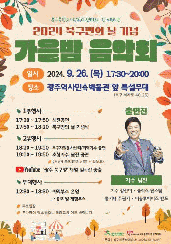 이어서 열리는 가을밤 음악회 무대에는 북구자원봉사센터, 지역 가수들의 흥겨운 공연과 메인 초대 가수인 ‘남진’의 ‘축하 공연’이 펼쳐지며 주민들에게 가을밤 낭만을 선사할 예정이다.