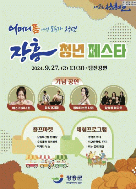 김성 장흥군수는 “아름다운 탐진강의 풍광과 함께 열정적인 지역 청년들이 운영하는 플프마켓, 청년 부스에 많은 관심과 참여 바라며, 이번 행사가 전세대가 함께 어울려 즐기는 화합의 장이 되길 바란다”고 전했다.