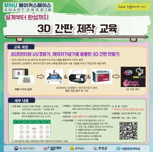 이번 2기 과정에서는 디자인 설계부터 3D프린터, UV경화기, 레이저가공기 장비를 활용하여 직접 3D 간판을 제작해 보는 실습 과정으로 교육이 진행된다.