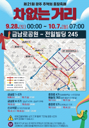 주요 통제 구역은 금남로공원부터 전일빌딩 245까지로 이곳은 28일 자정~10월7일 오전 7시까지 차 없는 거리로 운영한다.