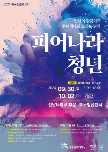 전남대학교 후문 일원 등에서 진행되는 이번 축제는 인생의 황금기인 청년 세대 모두가 도약하라는 의미를 담은 ‘피어나라 청년’을 주제로 청년이 직접 기획하고 참여한 다채로운 프로그램이 운영된다.