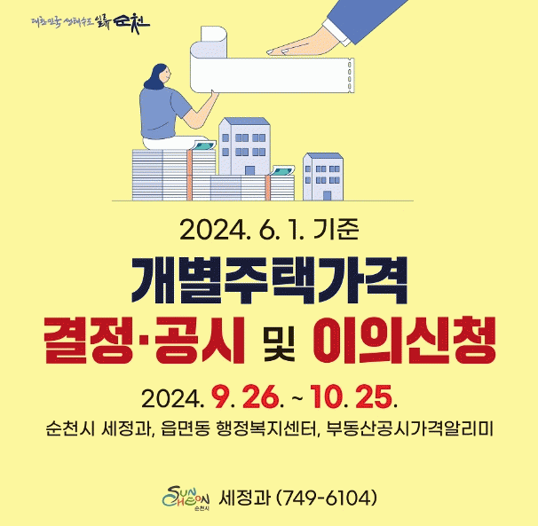 개별주택가격은 순천시 누리집과 부동산공시가격알리미를 통해 열람 가능하고, 가격에 이의가 있는 소유자 등은 10월 25일까지 순천시 세정과 또는 각 읍면동 행정복지센터에 이의 신청서를 제출하면 된다.