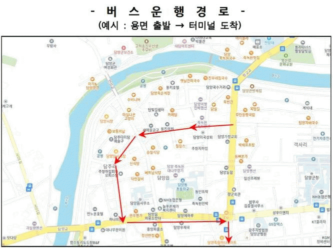 또한 담양 임시시장이었던 삼거리에 버스 표지판을 설치하고, 장날 한쪽 방면 주․정차 안내 현수막 게시, 도로 모퉁이 러버콘 설치 등으로 차량 흐름을 원활하게 해 버스 이용객의 편의를 높이고자 한다.