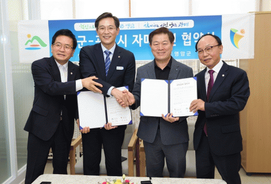 포럼장에서 영암군과 경기도 광명시(시장 박승원)는 ‘자매결연 협약식’을 열고, 농산물 판매, 공동체 자산구축과 지역순환경제 모델 교류, 자치분권 및 지속가능한 지방 발전 등을 바탕으로 교류와 협력을 강화하기로 약속했다.