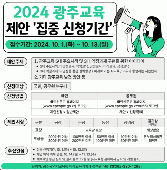 시교육청은 1일부터 13일까지 국민과 공무원을 대상으로 ‘2024년 하반기 광주교육 제안 집중 신청 기간’을 운영한다.