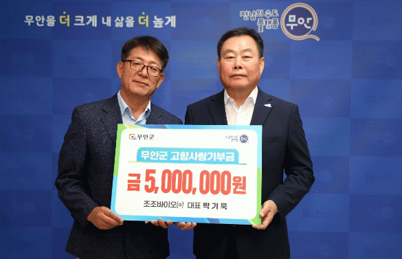 조조바이오㈜는 친환경 액상 비료 등 유기질 비료와 상토를 제조하는 무안군 관내 신생기업으로써 평소 농촌지역의 발전을 위해 힘을 보태고자 노력하는 박기욱 대표가 고향사랑기부제의 취지에 크게 공감하며 마음의 고향 무안군으로 기부에 참여하게 되었다고 전했다.
