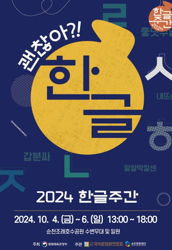 한편, 2024 한글주간 문화예술행사는 문화체육관광부 주최, (사)국어문화원연합회 주관으로 공모에 선정된 순천시, 인천을 비롯해 광화문광장과 한글박물관에서 한글에 관련된 다양한 행사가 펼쳐질 예정이다.