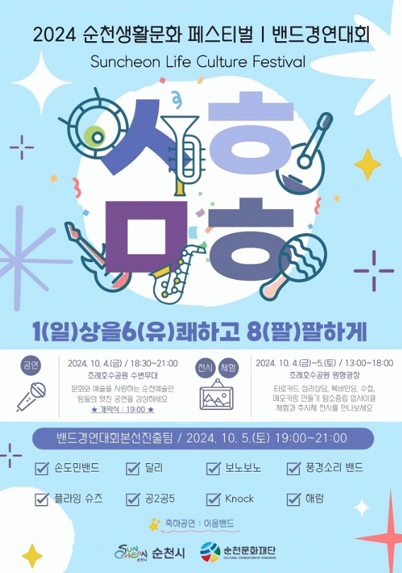 순천문화재단 관계자는 “이번 생활문화페스티벌은 순천 생활문화단체들의 역량을 마음껏 발휘할 수 있는 축제인 만큼 시민들의 많은 관심과 참여를 바란다”고 말했다.
