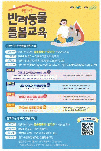 반려동물 문화교실은 광산구 청소년 수련관에서 △‘나는 SOLO’ 닥터 솔루션 △댕댕이 자가(셀프) 집밥 교실 △독(Dog) 요법(테라피) 관리 △하모니 산책교실(이론‧실습, 2회) 등 총 4개 과목을 진행한다.