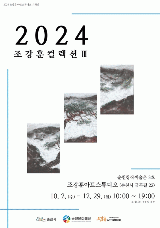 (재)순천문화재단에서 수탁 운영 중인 순천창작예술촌 3호 조강훈 아트스튜디오(금곡길 22)는 오전 10시에서 오후 7시까지 운영되며 월요일과 화요일은 휴관이다.