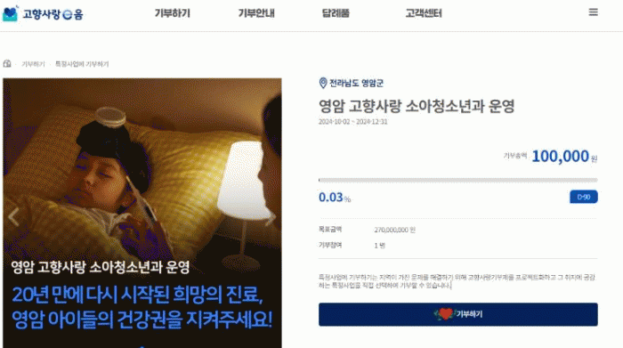 영암군은 이번 지정기부로 고향사랑소아청소년과 인건비를 마련에 나서, 연말까지 2억7,000만원을 모금한다는 목표다.