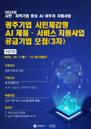 인공지능(AI) 바우처 지원사업의 참여를 희망하는 광주 인공지능기업은 오는 11일까지 인공지능산업융합사업단 누리집을 통해 신청하면 된다.