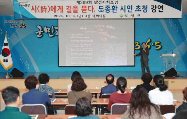 이번 자치포럼은 자연과 삶, 그리고 사람에 대한 깊은 통찰로 많은 독자에게 사랑받는 도종환 시인의 강의를 듣기 위해 보성문화원, 한국문인협회 보성지부, 보성군여성단체협의회 등 여러 사회단체와 많은 군민들이 참여한 가운데 진행됐다.