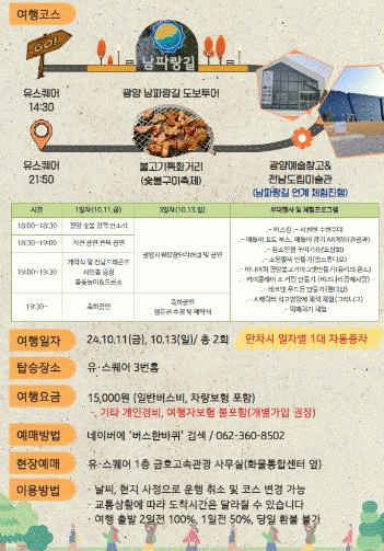 저녁에는 광양전통숯불구이축제가 열리는 광양불고기특화거리로 이동해 식사를 해결하고 축제를 즐긴 뒤 9시 50분에 광주 유스퀘어에 도착하는 것으로 일정이 종료된다.