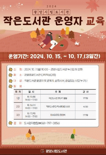 수강을 원하는 사람은 10월 7일부터 광양시립도서관 누리집(홈페이지)에 접속하거나 광양시립도서관에 전화로 신청할 수 있다.