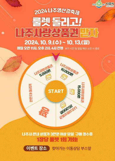 전라남도 나주시는 축제장인 영산강 정원 목사고을시장 홍보관 부스에서 ‘소비자 룰렛 이벤트’를 9일부터 13일까지 5일간 진행한다고 밝혔다.