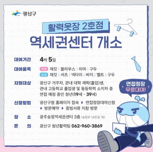 정장은 4박 5일 동안 대여할 수 있으며, 광산구 누리집에서 사전 신청 후 필요 서류(광산구 누리집 면접정장대여신청 참조)를 지참해 방문하면 된다.