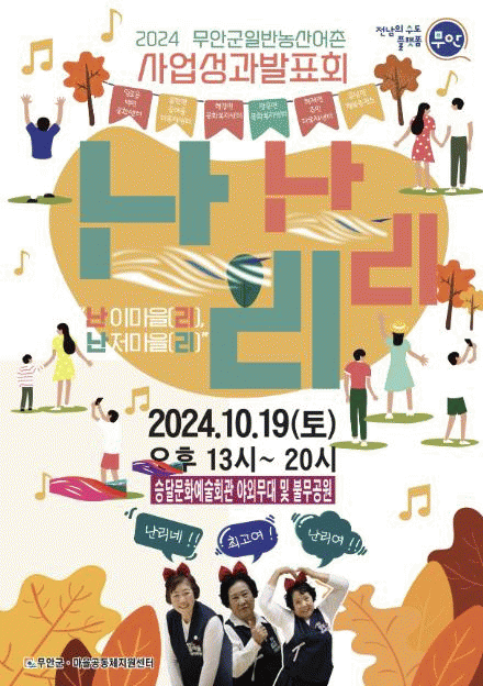 난리난리 행사는 무안군과 마을공동체 주관으로 지난해에 처음 시작했으며, 읍‧면들과 마을이 모여 지역의 자긍심을 고취하고 화합과 소통을 주제로 군민이 주체가 되는 일반농산어촌개발사업 준공지구 사업성과 발표회이다.