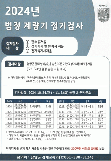 검사는 담양읍, 봉산면 등 12개 읍·면사무소에서 진행하며, 부착식 저울 등 이동이 어렵거나 다수의 저울이 있는 경우에는 10월 21일까지 해당 읍·면사무소에 방문 검사(소재 검사)를 신청하면 11월 4일부터 5일까지 검사를 진행할 예정이다.