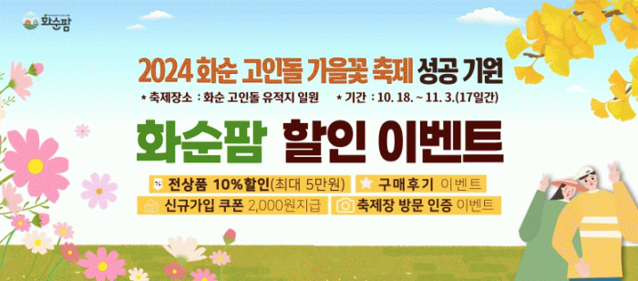 할인 쿠폰은 화순팜 회원에게 전 상품 10% 할인 쿠폰(최대 5만 원)과 신규회원에게는 2,000원 할인 쿠폰을 추가로 지급한다.