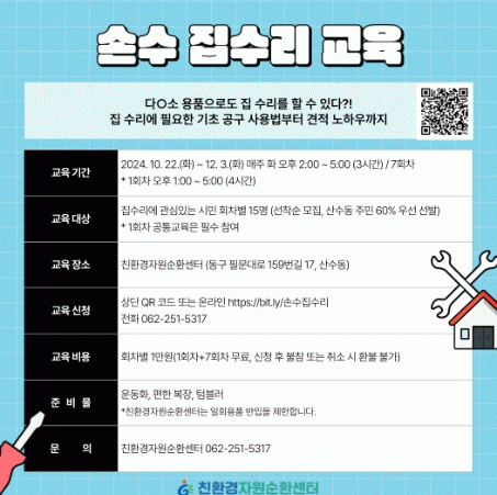 동구 주민이라면 누구나 참여할 수 있으며, 회차별 15명 선착순 모집한다. 참가비는 회차별 1만 원이다. 참가 신청은 QR코드(링크), 전화, 블로그(친환경자원순환센터)에서 가능하다.