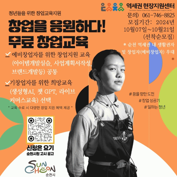이번 워크숍은 순천 역세권 내 창업자 및 예비 창업자, 생활권자인 순천 시민을 우대적으로 모집하며 선착순 20명을 대상으로 교육을 진행한다.