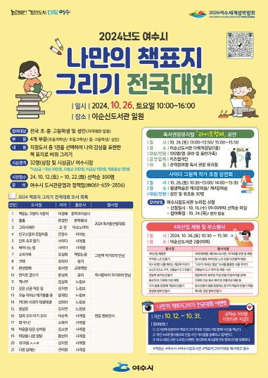 이번 대회는 여수시립도서관이 선정한 21권 도서 중 1권을 선택해 감상한 후 책 표지를 직접 재구성하여 그리는 대회로, 지역 제한 없이 전국의 초·중·고등학생 및 성인 누구나 참가할 수 있다.