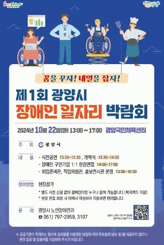 광양시는 오는 22일 광양국민체육센터에서 “꿈을 꾸자! 내일을 잡자!”라는 슬로건으로 ‘제1회 장애인 일자리 박람회’가 개최된다고 밝혔다.
